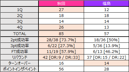 〇 秋田 85 - 57 福島 ●